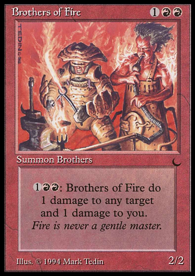 | Oracle Text | {{1}}{{r}}{{r}}: Brothers of Fire deals 1 damage to target creature or player and 1 damage to you. | ||