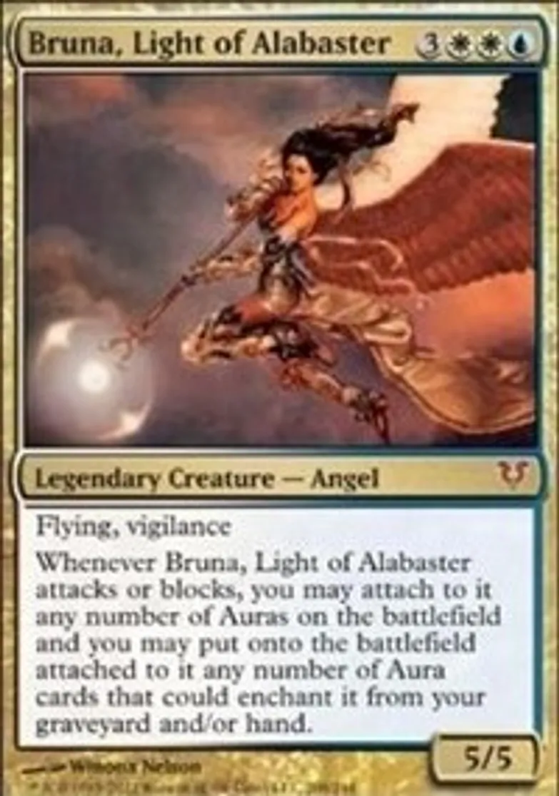 Whenever Bruna, Light of Alabaster attacks or blocks, you may attach to it any number of Auras on the battlefield and you may put onto the battlefield attached to it any number of Aura cards that could enchant it from your graveyard and/or hand. | ||