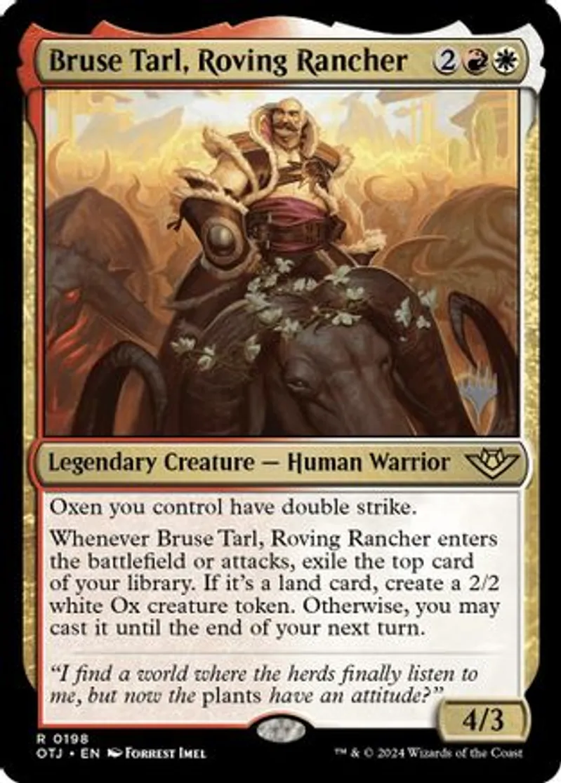 Bruse Tarl, Roving Rancher is a Rare in the set Promo Pack: Outlaws of Thunder Junction.