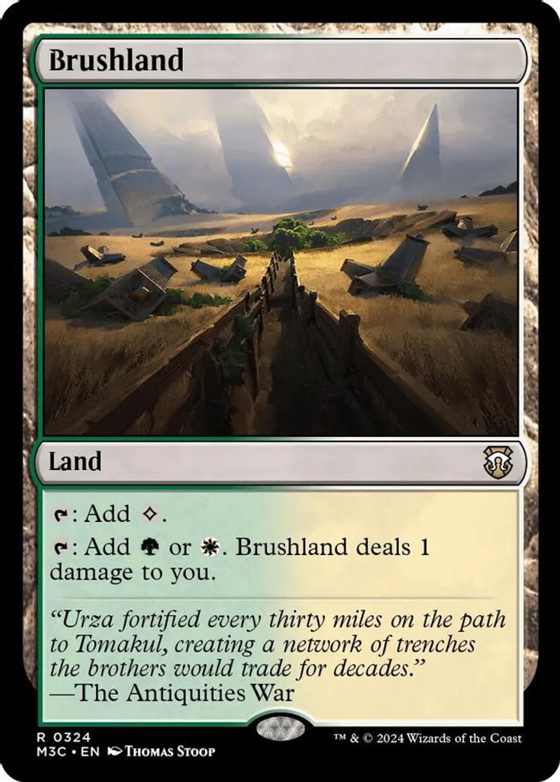Magic: the Gathering (mtg) Rare land Brushland from Modern Horizons 3 Commander (M3C) last updated 2025-12-13 15:21:31