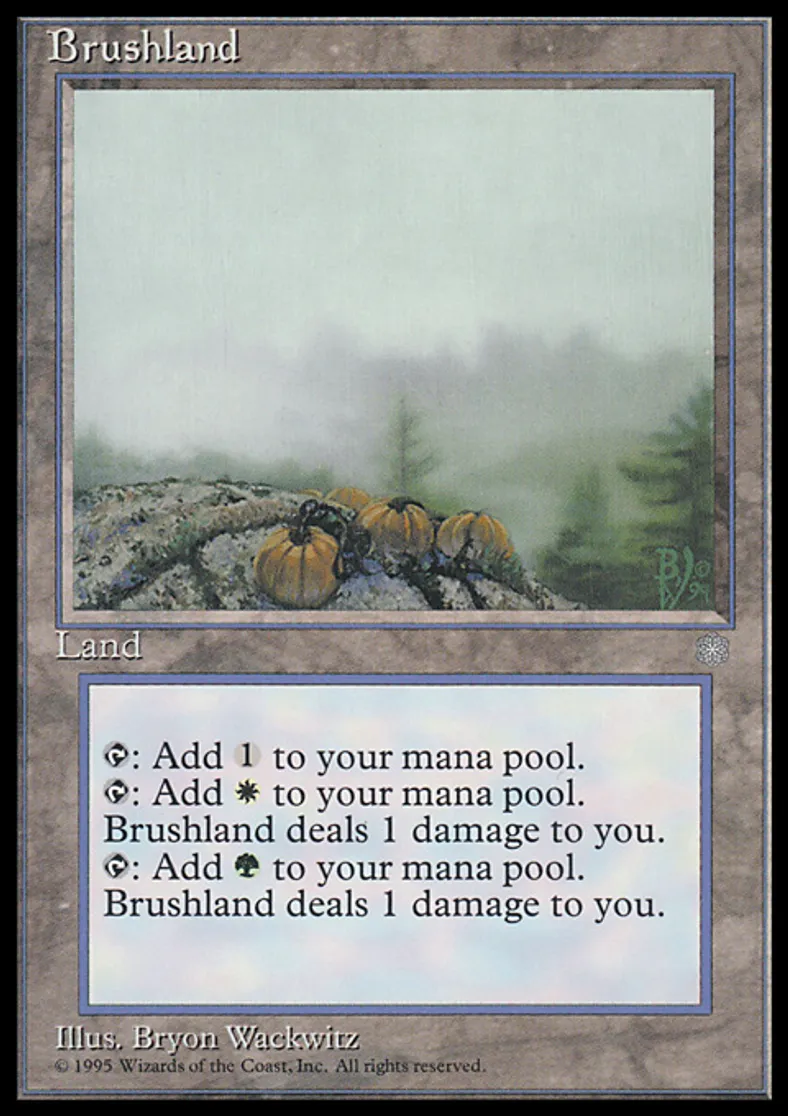 | Oracle Text | {{t}}: Add {{1}} to your mana pool. {{t}}: Add {{g}} or {{w}} to your mana pool. Brushland deals 1 damage to you. | ||