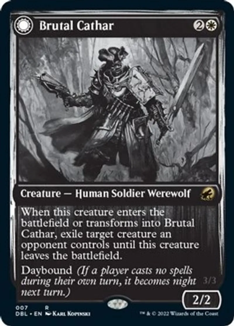 Magic: the Gathering (mtg) Rare Creature — Human Soldier Werewolf Brutal Cathar from Innistrad: Double Feature (dbl) last updated 2026-02-21 15:39:32