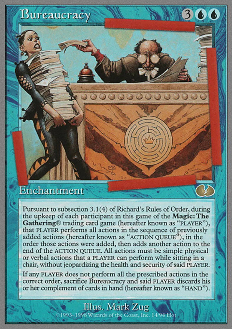 | Oracle Text | Pursuant to subsection 3.1(4) of Richard's Rules of Order, during the upkeep of each participant in this game of the Magic: The Gathering® trading card game (hereafter known as "PLAYER"), that PLAYER performs all actions in the sequence of previously added actions (hereafter known as "ACTION QUEUE"), in the order those actions were added, then adds another action to the end of the ACTION QUEUE. All actions must be simple physical or verbal actions that a player can perform while sitting in a chair, without jeopardizing the health and security of said PLAYER. If any PLAYER does not perform all the prescribed actions in the correct order, sacrifice Bureaucracy and said PLAYER discards his or her complement of cards in hand (hereafter known as "HAND"). | ||