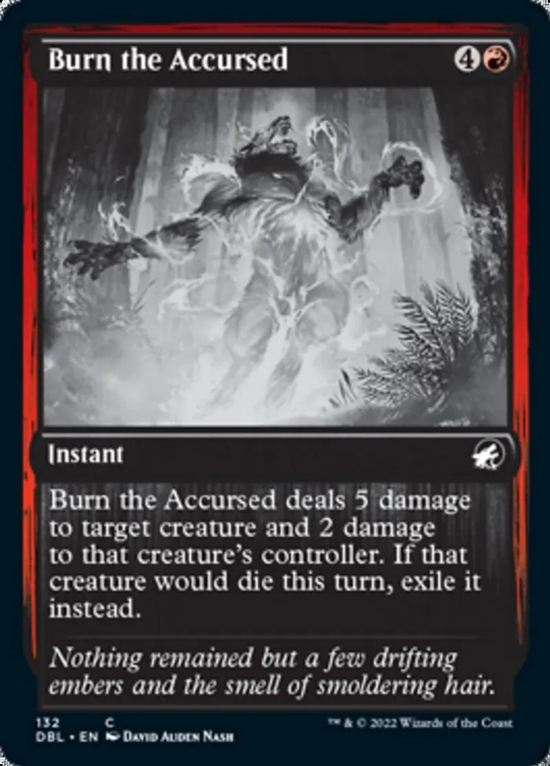 | Oracle Text | Burn the Accursed deals 5 damage to target creature and 2 damage to that creature's controller. If that creature would die this turn, exile it instead. | ||