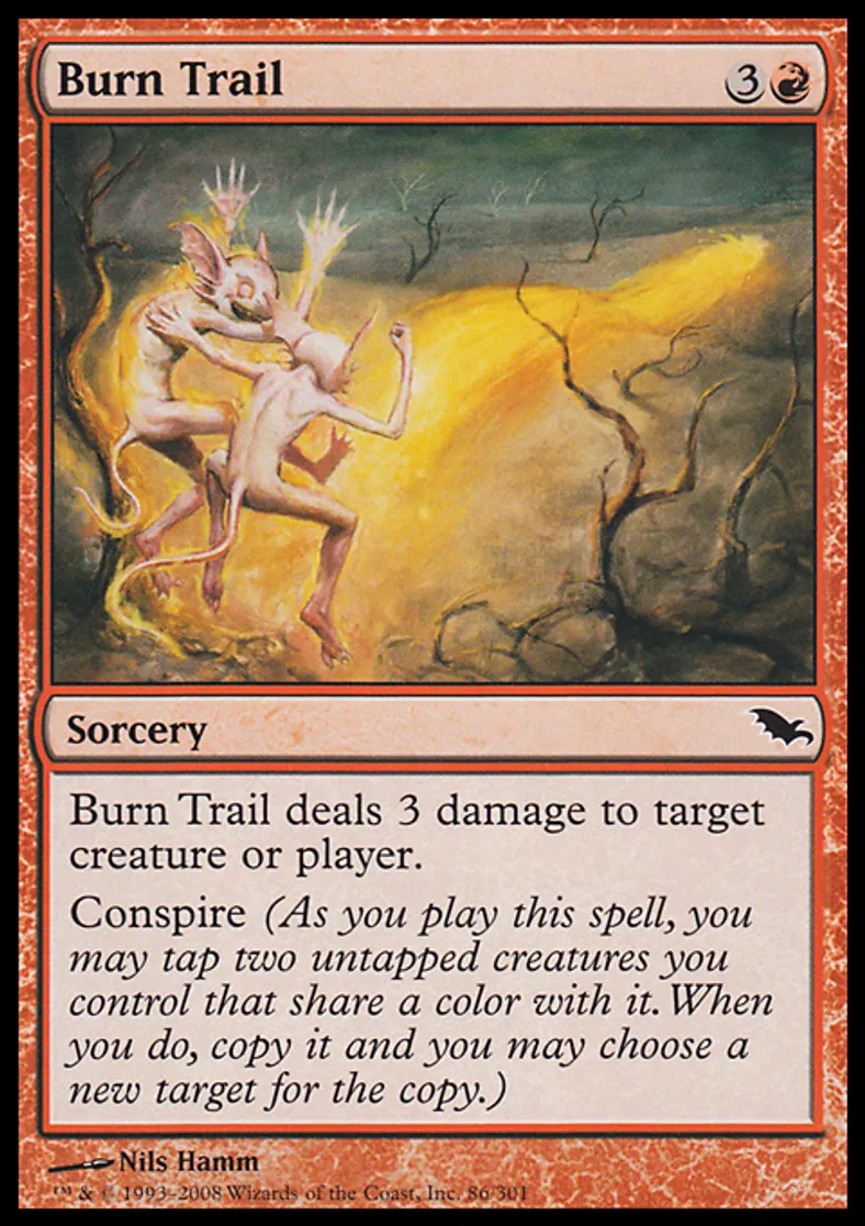 | Oracle Text | Burn Trail deals 3 damage to target creature or player. Conspire (As you cast this spell, you may tap two untapped creatures you control that share a color with it. When you do, copy it and you may choose a new target for the copy.) | ||