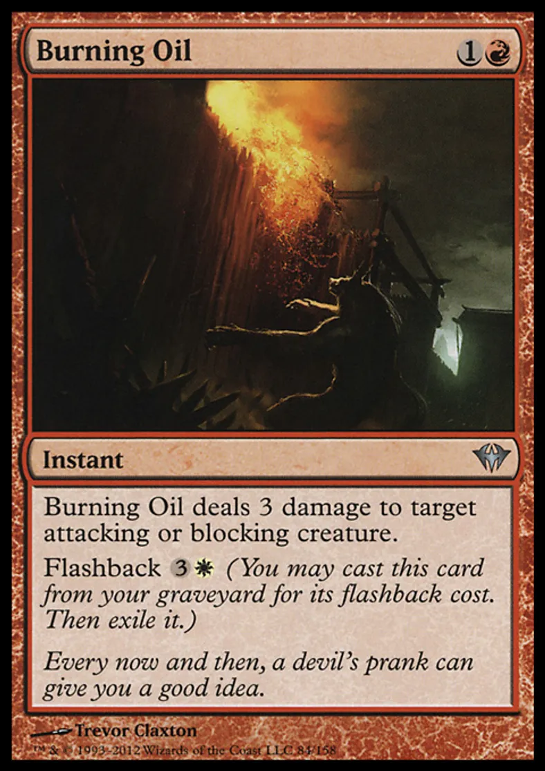 | Oracle Text | Burning Oil deals 3 damage to target attacking or blocking creature. Flashback {{3}}{{w}} (You may cast this card from your graveyard for its flashback cost. Then exile it.) | ||