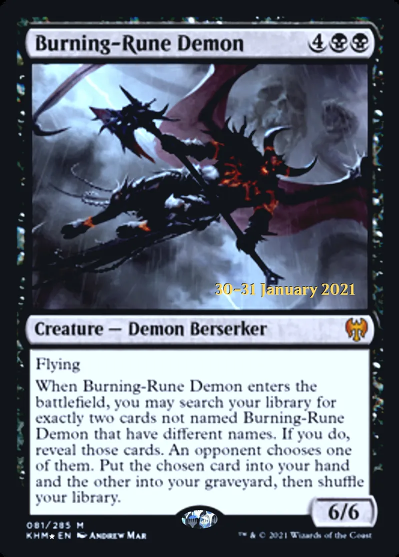 When Burning-Rune Demon enters the battlefield, you may search your library for exactly two cards not named Burning-Rune Demon that have different names. If you do, reveal those cards. An opponent chooses one of them. Put the chosen card into your hand and the other into your graveyard, then shuffle your library. | ||