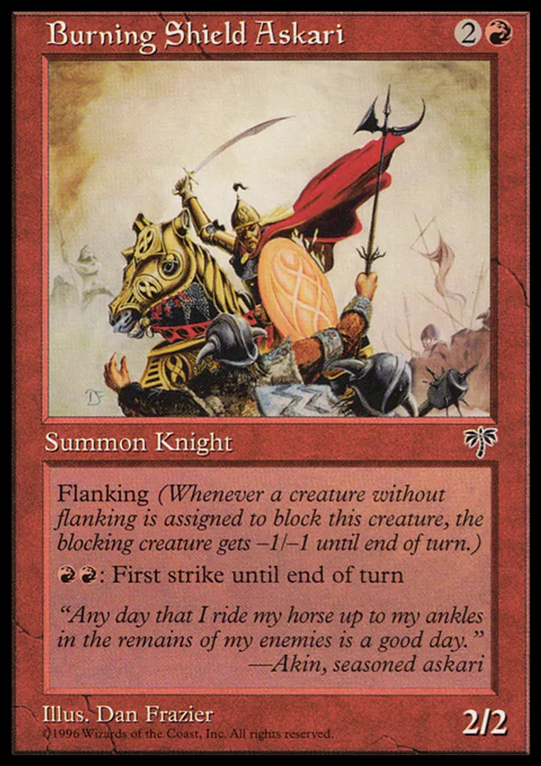 | Oracle Text | Flanking (Whenever a creature without flanking blocks this creature, the blocking creature gets -1/-1 until end of turn.) {{r}}{{r}}: Burning Shield Askari gains first strike until end of turn. | ||