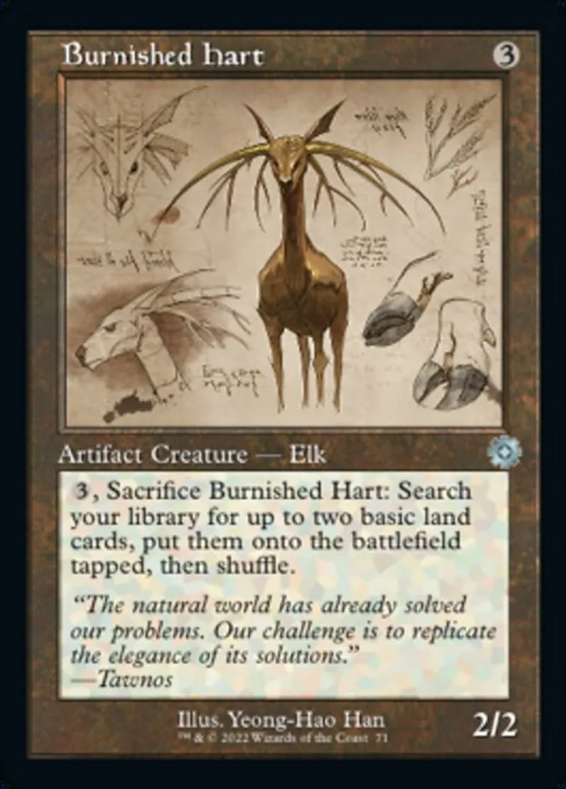 | Oracle Text | {{3}}, Sacrifice Burnished Hart: Search your library for up to two basic land cards, put them onto the battlefield tapped, then shuffle. | ||