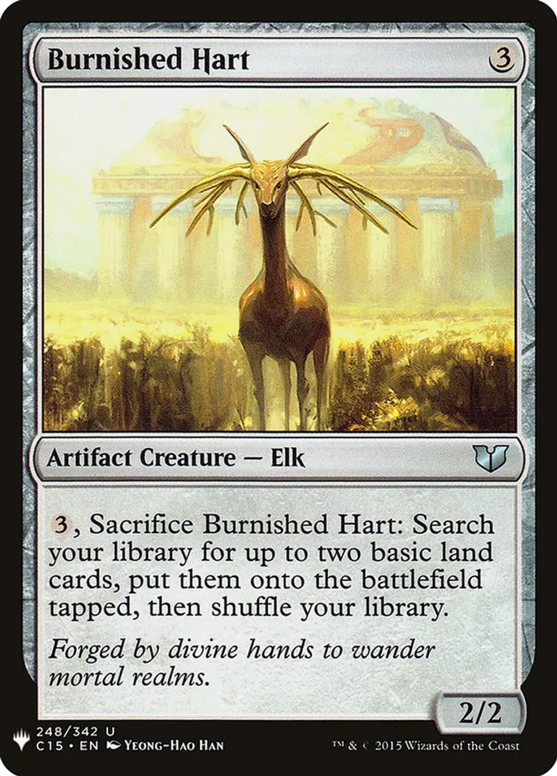| Oracle Text | {3}, Sacrifice Burnished Hart: Search your library for up to two basic land cards, put them onto the battlefield tapped, then shuffle your library. | ||