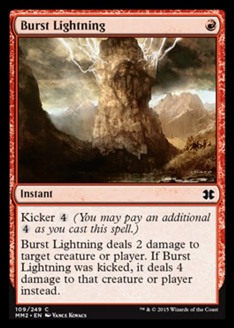 | Oracle Text | Kicker {{4}} (You may pay an additional {{4}} as you cast this spell.) Burst Lightning deals 2 damage to target creature or player. If Burst Lightning was kicked, it deals 4 damage to that creature or player instead. | ||