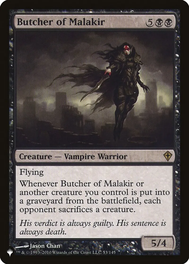 Whenever Butcher of Malakir or another creature you control dies, each opponent sacrifices a creature. | ||
