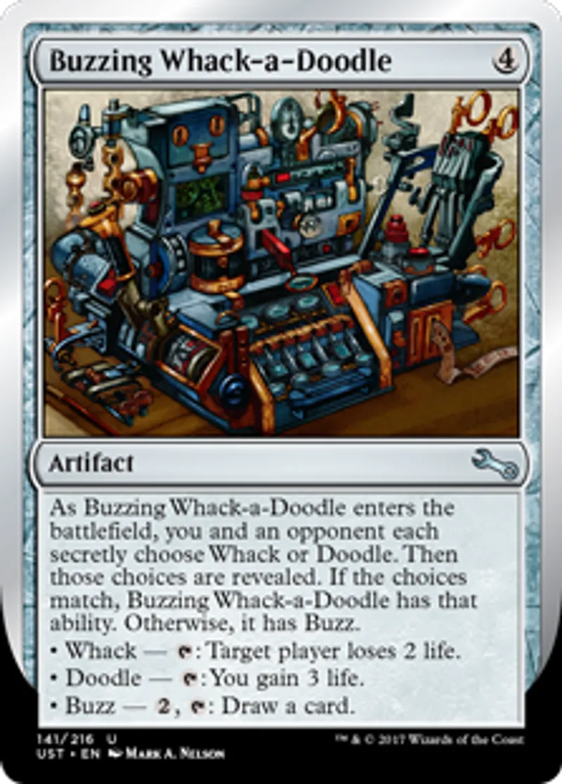 | Oracle Text | As Buzzing Whack-a-Doodle enters the battlefield, you and an opponent each secretly choose Whack or Doodle. Then those choices are revealed. If the choices match, Buzzing Whack-a-Doodle has that ability. Otherwise, it has Buzz. • Whack — {{t}}: Target player loses 2 life. • Doodle — {{t}}: You gain 3 life. • Buzz — {{2}}, {{t}}: Draw a card. | ||