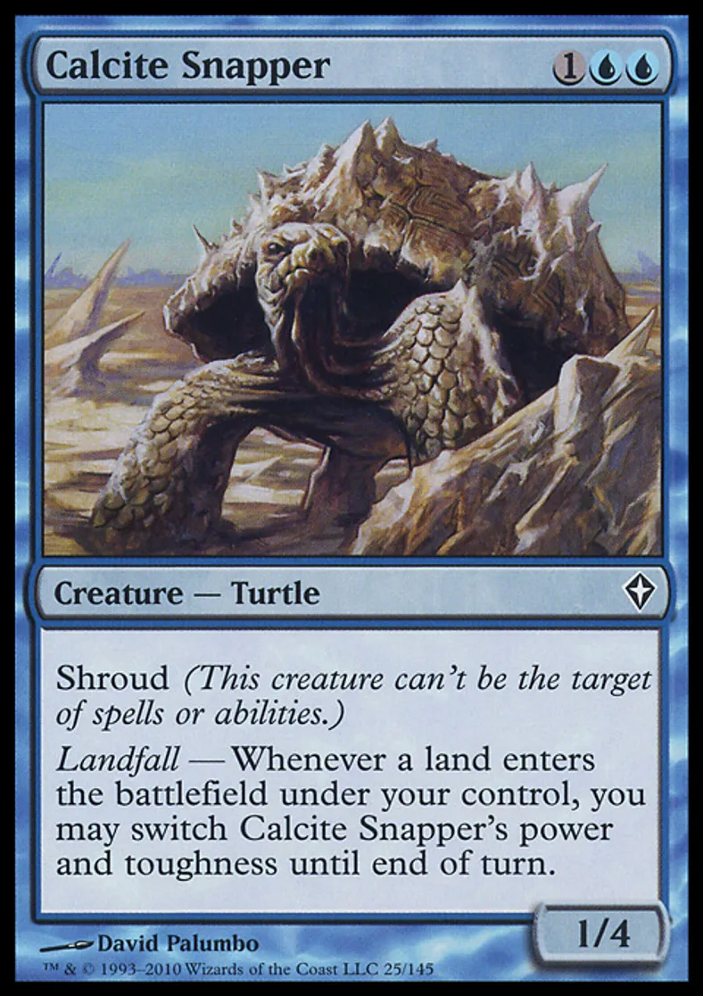| Oracle Text | Shroud (This creature can't be the target of spells or abilities.) Landfall — Whenever a land enters the battlefield under your control, you may switch Calcite Snapper's power and toughness until end of turn. | ||