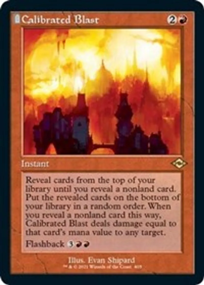 | Oracle Text | Reveal cards from the top of your library until you reveal a nonland card. Put the revealed cards on the bottom of your library in a random order. When you reveal a nonland card this way, Calibrated Blast deals damage equal to that card’s mana value to any target.
