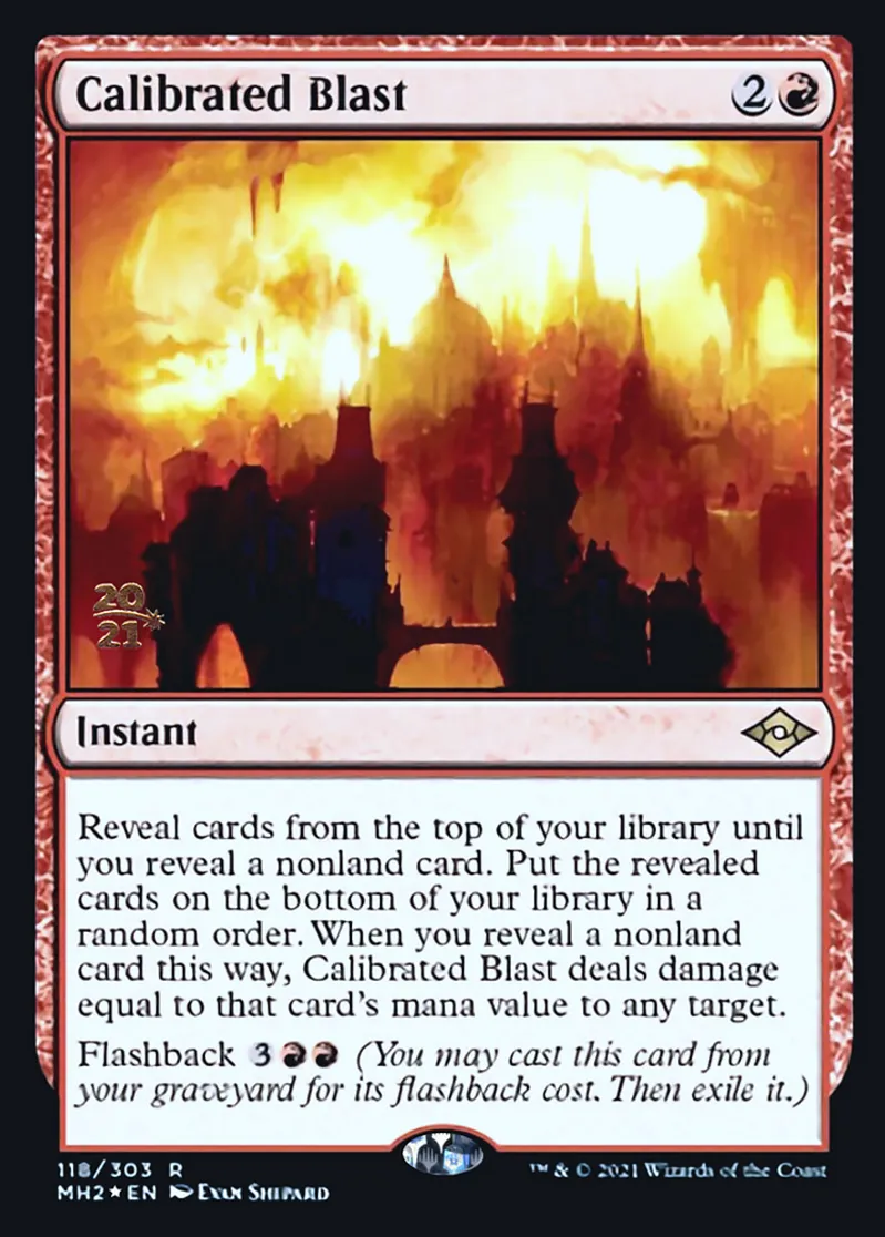 | Oracle Text | Reveal cards from the top of your library until you reveal a nonland card. Put the revealed cards on the bottom of your library in a random order. When you reveal a nonland card this way, Calibrated Blast deals damage equal to that card's mana value to any target.