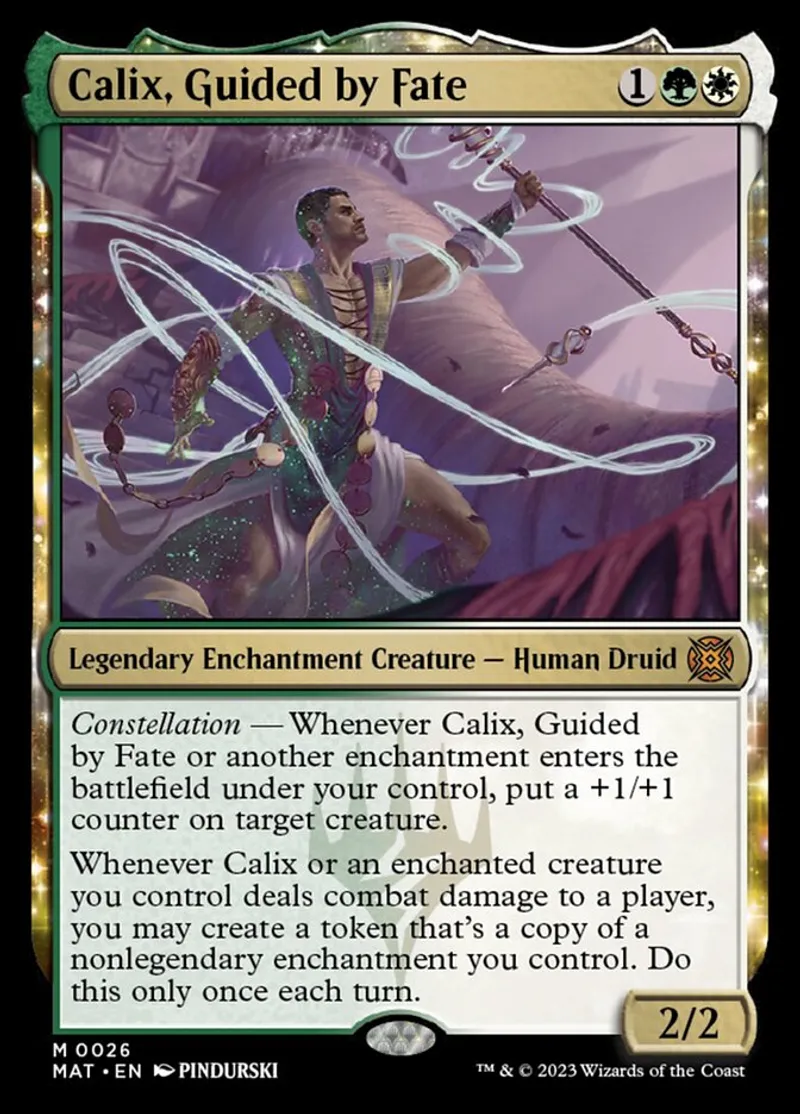 Magic: the Gathering (mtg) mythic Legendary Enchantment Creature — Human Druid Calix, Guided by Fate from March of the Machine: The Aftermath (mat) last updated 2026-02-25 15:43:06