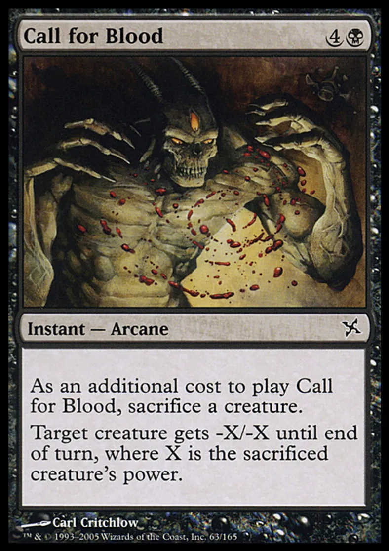 | Oracle Text | As an additional cost to cast Call for Blood, sacrifice a creature. Target creature gets -X/-X until end of turn, where X is the sacrificed creature's power. | ||