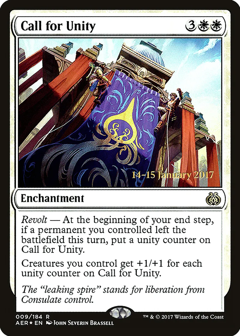 | Oracle Text | Revolt — At the beginning of your end step, if a permanent you controlled left the battlefield this turn, put a unity counter on Call for Unity.