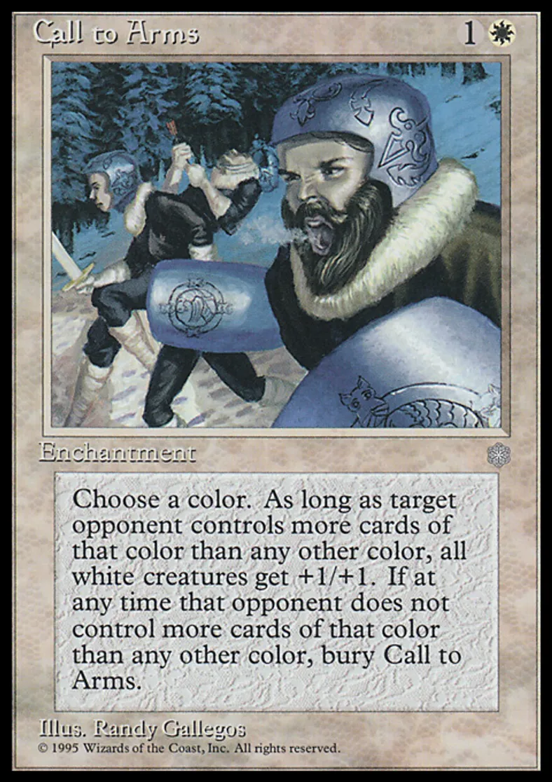 | Oracle Text | As Call to Arms enters the battlefield, choose a color and an opponent. White creatures get +1/+1 as long as the chosen color is the most common color among nontoken permanents the chosen player controls but isn't tied for most common. When the chosen color isn't the most common color among nontoken permanents the chosen player controls or is tied for most common, sacrifice Call to Arms. | ||