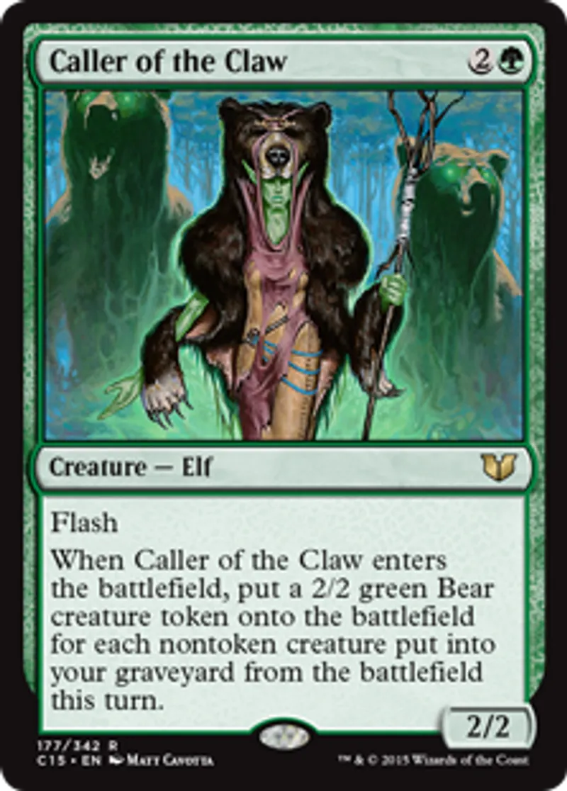 | Oracle Text | Flash When Caller of the Claw enters the battlefield, put a 2/2 green Bear creature token onto the battlefield for each nontoken creature put into your graveyard from the battlefield this turn. | ||