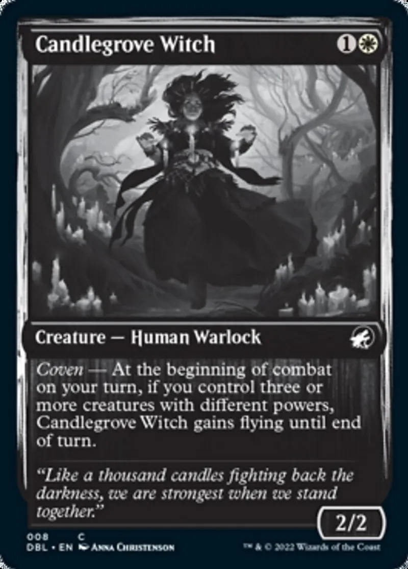 | Oracle Text | Coven — At the beginning of combat on your turn, if you control three or more creatures with different powers, Candlegrove Witch gains flying until end of turn. | ||