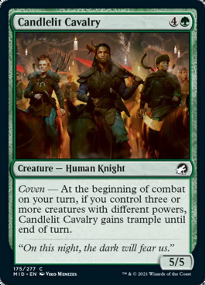 | Oracle Text | Coven — At the beginning of combat on your turn, if you control three or more creatures with different powers, Candlelit Cavalry gains trample until end of turn. | ||