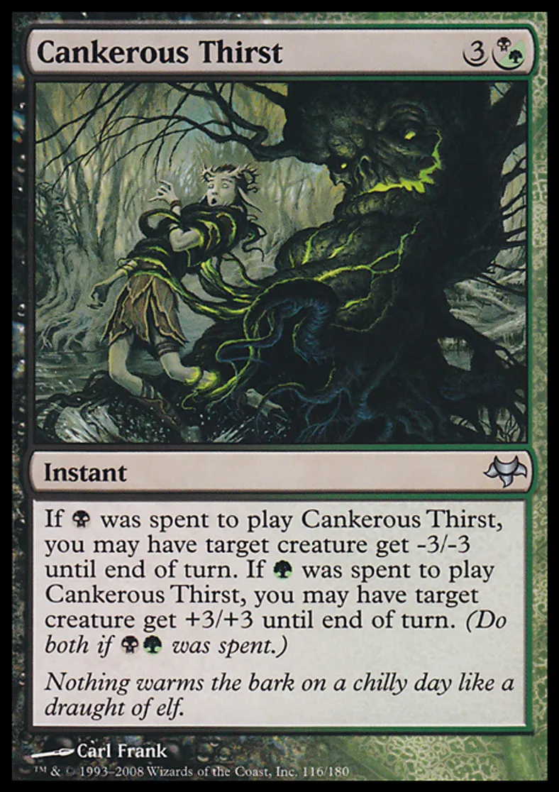 | Oracle Text | If {{b}} was spent to cast Cankerous Thirst, you may have target creature get -3/-3 until end of turn. If {{g}} was spent to cast Cankerous Thirst, you may have target creature get +3/+3 until end of turn. (Do both if {{b}}{{g}} was spent.) | ||
