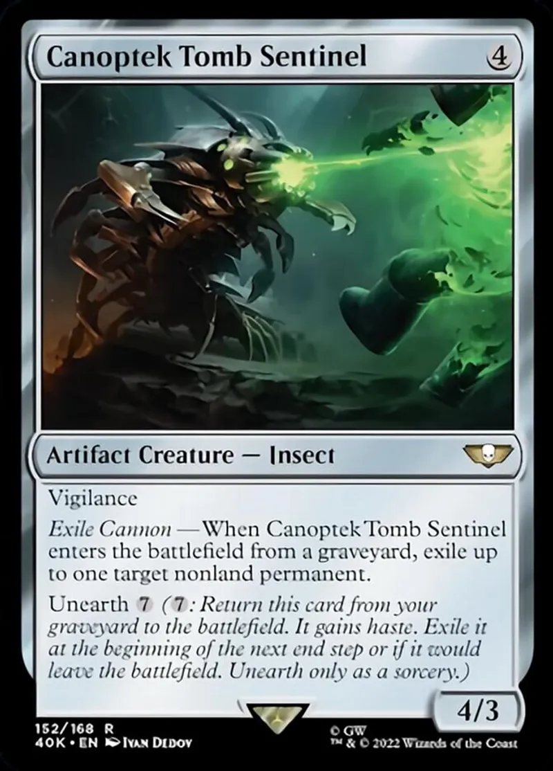 Exile Cannon — When Canoptek Tomb Sentinel enters the battlefield from a graveyard, exile up to one target nonland permanent.