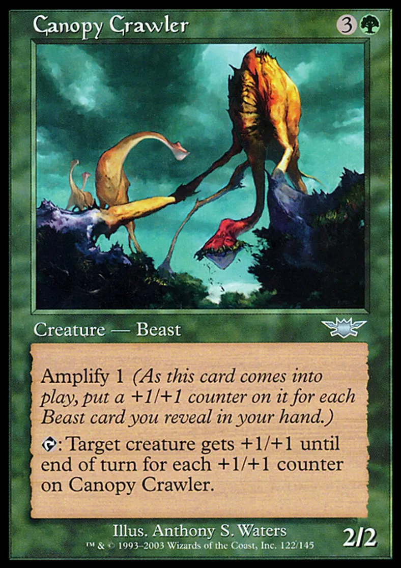 | Oracle Text | Amplify 1 (As this creature enters the battlefield, put a +1/+1 counter on it for each Beast card you reveal in your hand.) {{t}}: Target creature gets +1/+1 until end of turn for each +1/+1 counter on Canopy Crawler. | ||