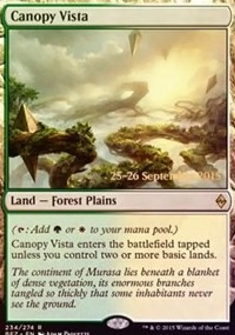 | Oracle Text | (T: Add G or W to your mana pool.)Canopy Vista enters the battlefield tapped unless you control two or more basic lands. | ||