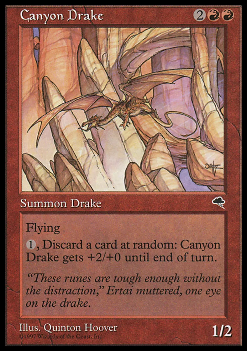 | Oracle Text | Flying {{1}}, Discard a card at random: Canyon Drake gets +2/+0 until end of turn. | ||