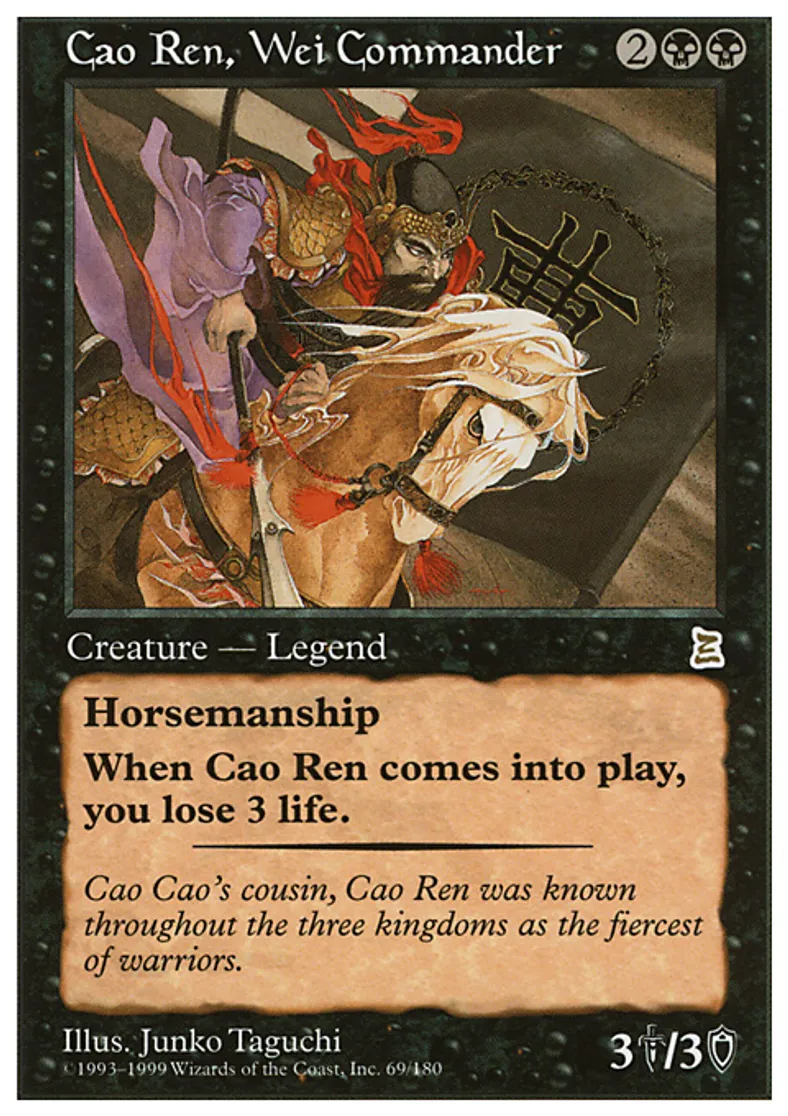 | Oracle Text | Horsemanship (This creature can't be blocked except by creatures with horsemanship.) When Cao Ren, Wei Commander enters the battlefield, you lose 3 life. | ||