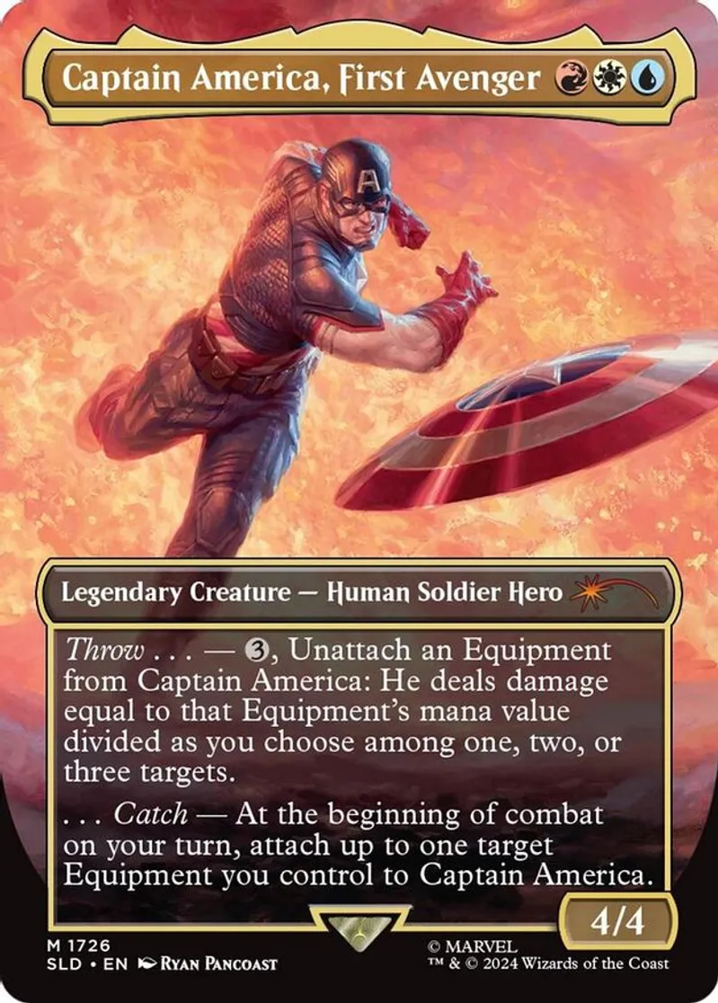 … catch — at the beginning of combat on your turn, attach up to one target equipment you control to captain america. when purchasing this unique product, please keep in mind that this card only appears in the secret lair x marvel superdrop and will ship out to you after the seller receives the product directly from wizards of the coast.the estimated time frame for sellers to receive stock is not fixed, so it could be anywhere between 1 - 10 weeks for delivery. | ||