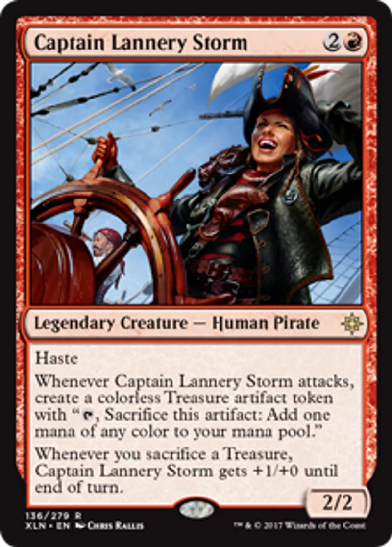 | Oracle Text | Haste Whenever Captain Lannery Storm attacks, create a colorless Treasure artifact token with "{{t}}, Sacrifice this artifact: Add one mana of any color to your mana pool." Whenever you sacrifice a Treasure, Captain Lannery Storm gets +1/+0 until end of turn. | ||
