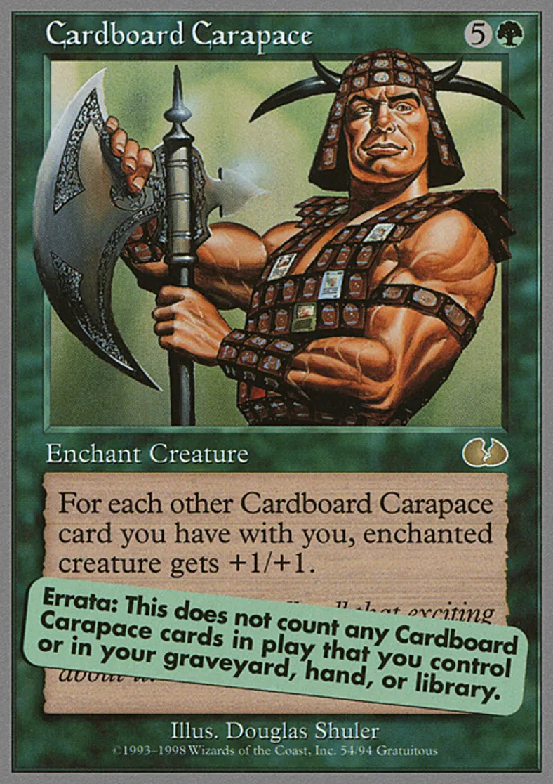| Oracle Text | For each other Cardboard Carapace card you have with you, enchanted creature gets +1/+1. Errata: This does not count any Cardboard Carapace cards in play that you control or in your graveyard, hand, or library. | ||