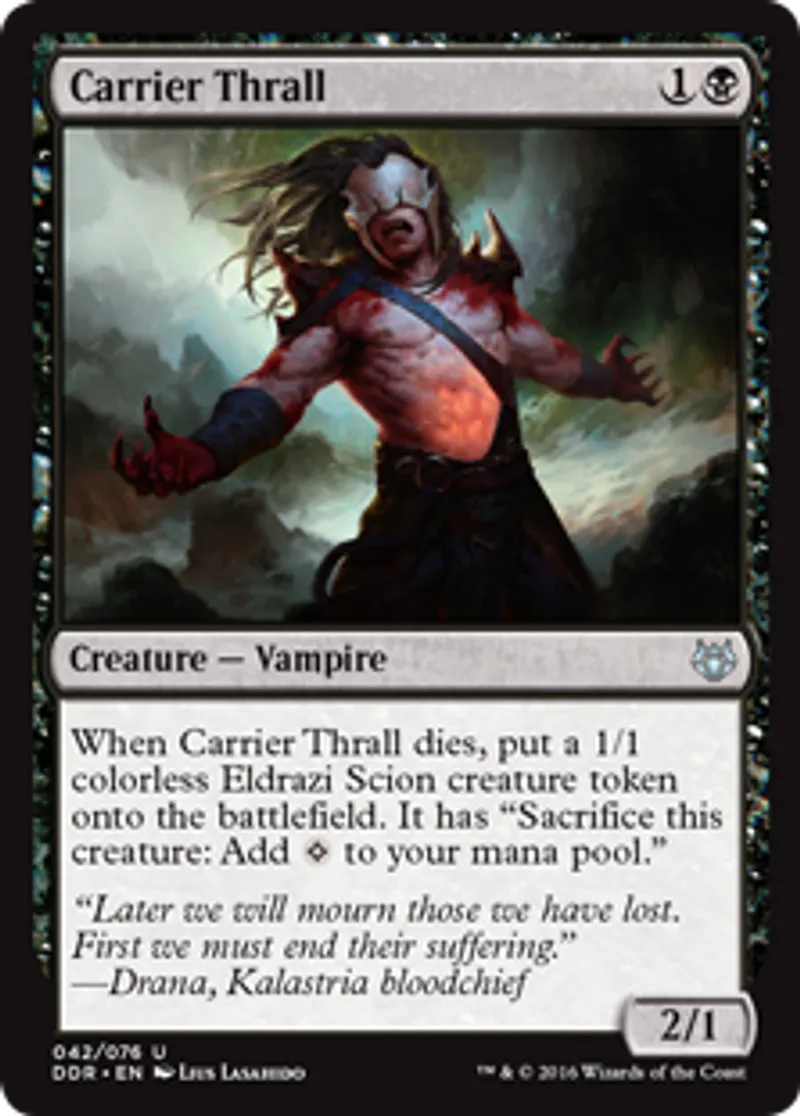 | Oracle Text | When Carrier Thrall dies, put a 1/1 colorless Eldrazi Scion creature token onto the battlefield. It has "Sacrifice this creature: Add {{Colorless}} to your mana pool." | ||