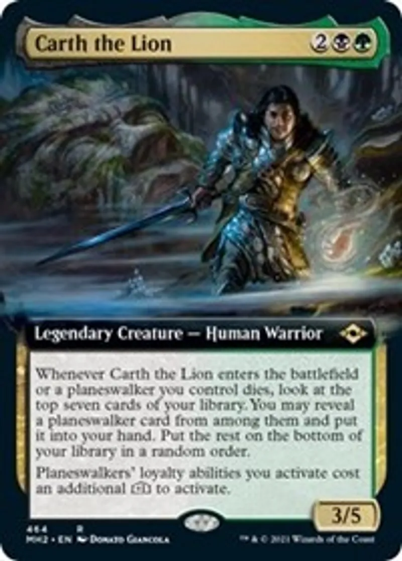 | Oracle Text | Whenever Carth the Lion enters the battlefield or a planeswalker you control dies, look at the top seven cards of your library. You may reveal a planeswalker card from among them and put it into your hand. Put the rest on the bottom of your library in a random order.
