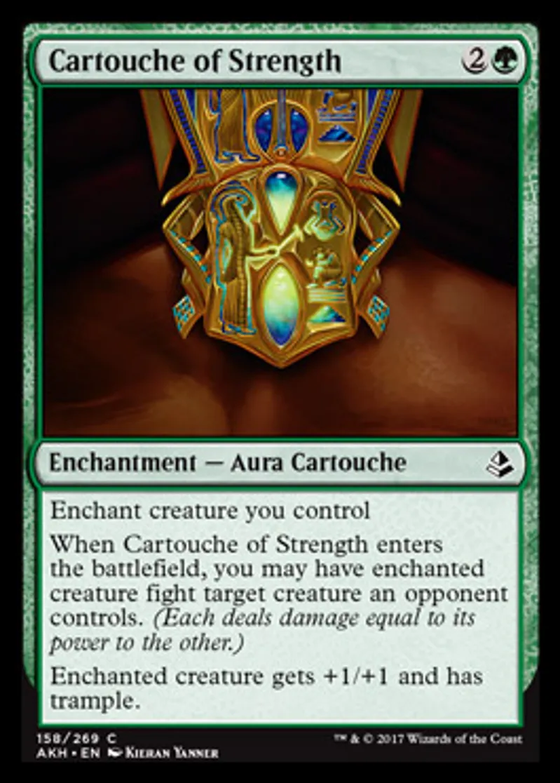 | Oracle Text | Enchant creature you control When Cartouche of Strength enters the battlefield, you may have enchanted creature fight target creature an opponent controls. (Each deals damage equal to its power to the other.) Enchanted creature gets +1/+1 and has trample. | ||