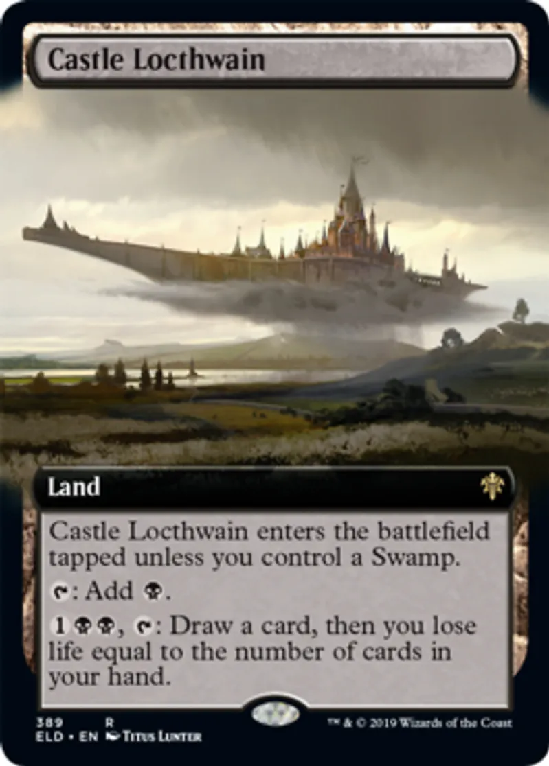 | Oracle Text | Castle Locthwain enters the battlefield tapped unless you control a Swamp.\r\n{{t}}: Add {{b}}.\r\n{{1}}{{b}}{{b}}, {{t}}: Draw a card, then you lose life equal to the number of cards in your hand. | ||