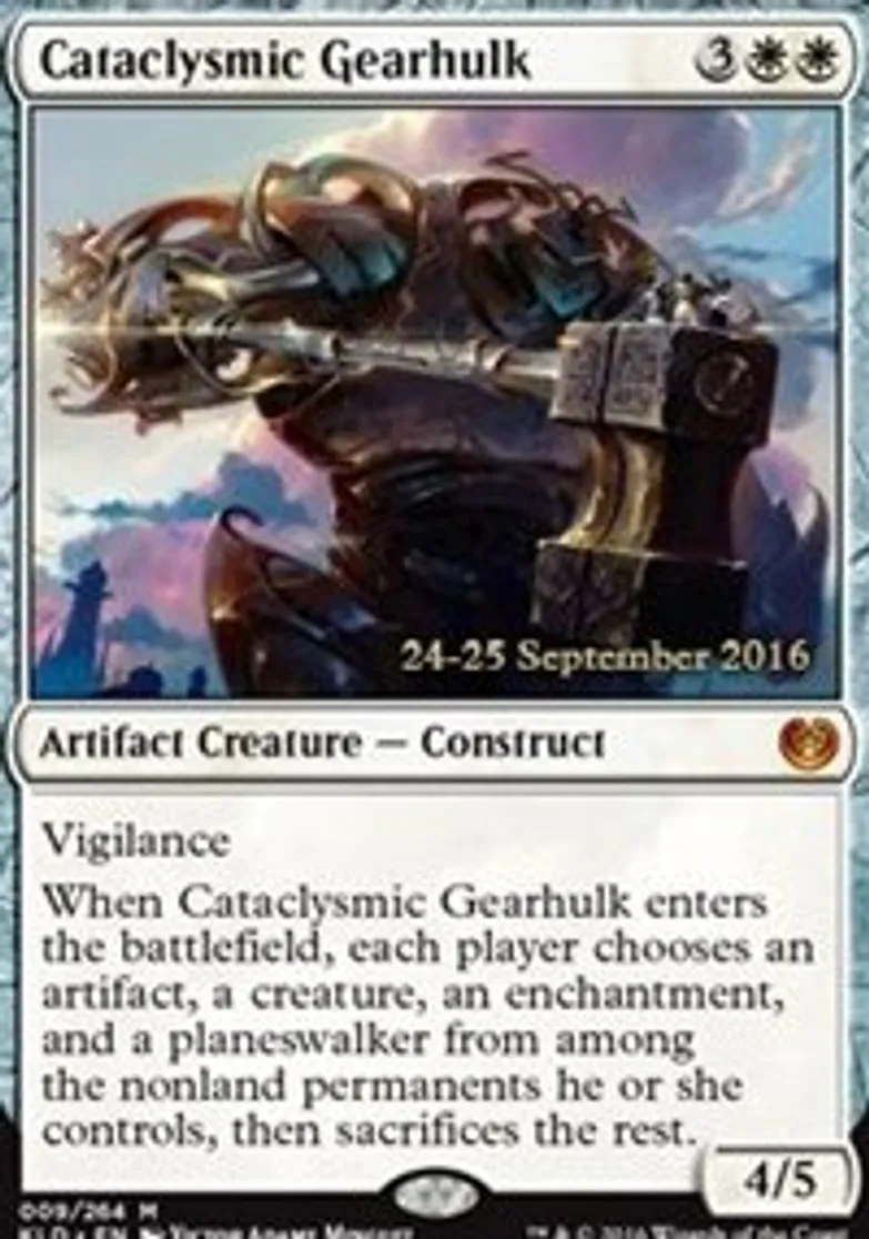 When Cataclysmic Gearhulk enters the battlefield, each player chooses an artifact, a creature, an enchantment, and a planeswalker from among the nonland permanents he or she controls, then sacrifices the rest. | ||