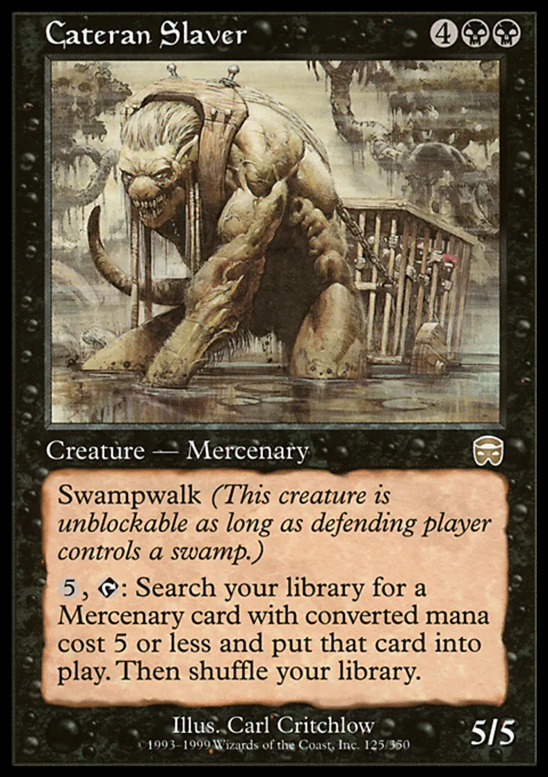 | Oracle Text | Swampwalk {{5}}, {{t}}: Search your library for a Mercenary permanent card with converted mana cost 5 or less and put it onto the battlefield. Then shuffle your library. | ||