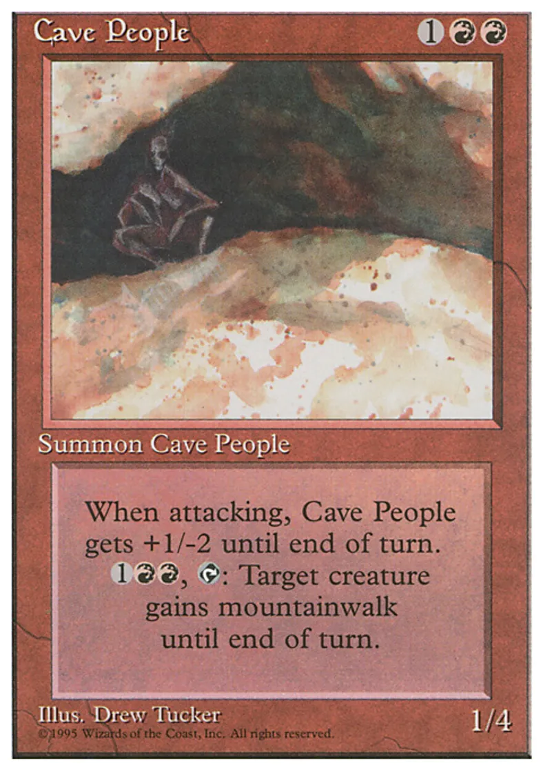 | Oracle Text | Whenever Cave People attacks, it gets +1/-2 until end of turn. {{1}}{{r}}{{r}}, {{t}}: Target creature gains mountainwalk until end of turn. | ||