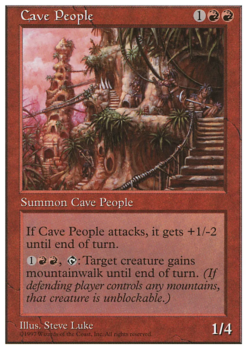 | Oracle Text | Whenever Cave People attacks, it gets +1/-2 until end of turn. {{1}}{{r}}{{r}}, {{t}}: Target creature gains mountainwalk until end of turn. | ||