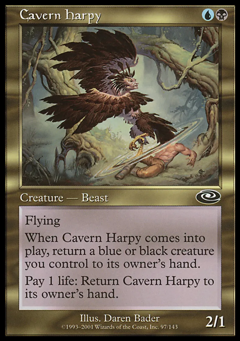 | Oracle Text | Flying When Cavern Harpy enters the battlefield, return a blue or black creature you control to its owner's hand. Pay 1 life: Return Cavern Harpy to its owner's hand. | ||