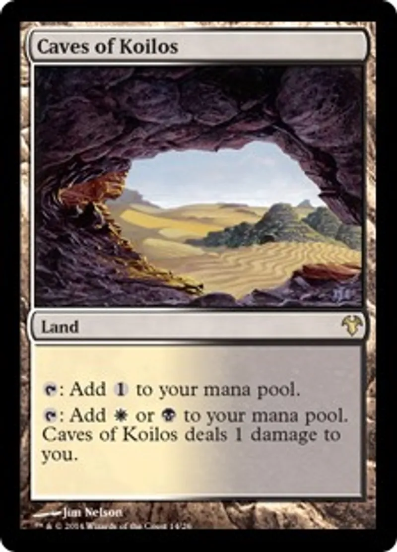 | Oracle Text | {{t}}: Add {{Colorless}} to your mana pool. {{t}}: Add {{w}} or {{b}} to your mana pool. Caves of Koilos deals 1 damage to you. | ||