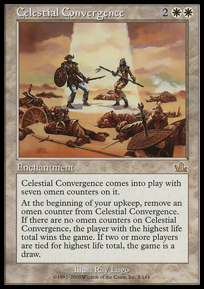 | Oracle Text | Celestial Convergence enters the battlefield with seven omen counters on it. At the beginning of your upkeep, remove an omen counter from Celestial Convergence. If there are no omen counters on Celestial Convergence, the player with the highest life total wins the game. If two or more players are tied for highest life total, the game is a draw. | ||
