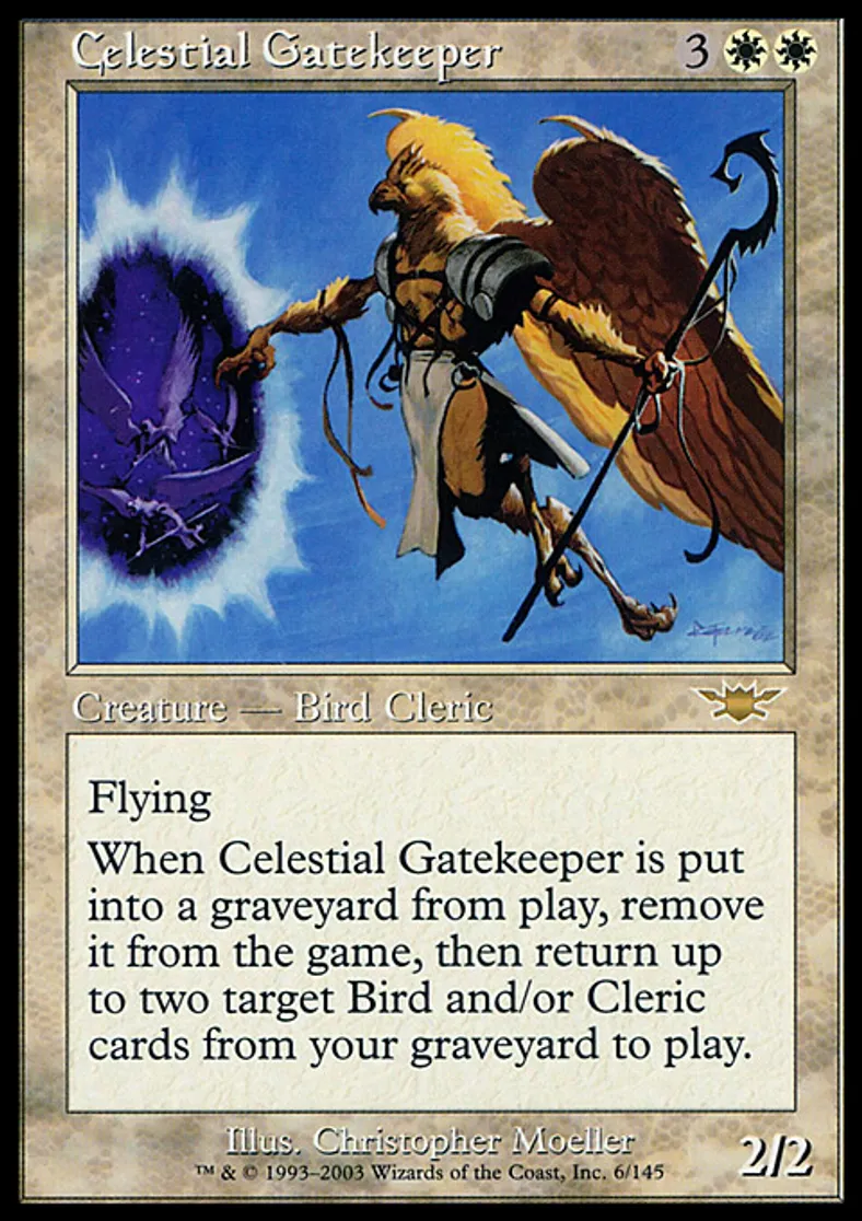 | Oracle Text | Flying When Celestial Gatekeeper dies, exile it, then return up to two target Bird and/or Cleric permanent cards from your graveyard to the battlefield. | ||