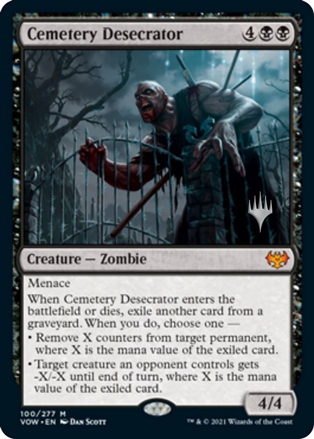 when cemetery desecrator enters the battlefield or dies, exile another card from a graveyard. when you do, choose one— • remove x counters from target permanent, where x is the mana value of the exiled card. • target creature an opponent controls gets -x/-x until end of turn, where x is the mana value of the exiled card. | ||