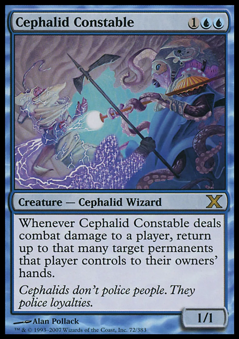 | Oracle Text | Whenever Cephalid Constable deals combat damage to a player, return up to that many target permanents that player controls to their owners' hands. | ||